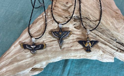 今回の展示会では、「生きる鉄」鯉龍、動く鉄、自在置物に挑戦しました。出品作品は、肥後象嵌を中心に、べっ甲象嵌や鹿角細工、天然石、シェル(貝殻)などのアクセサリーや小物、箱物を展示・販売します。