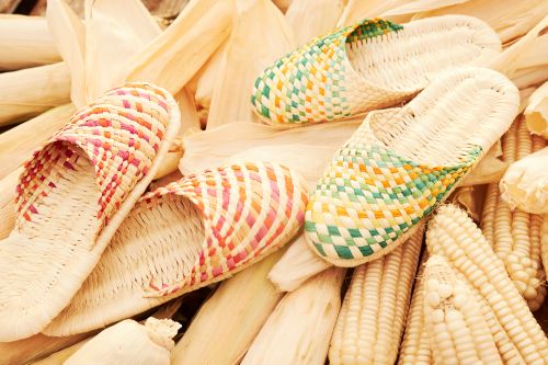 この展示会は、「履き物」をテーマに全国各地の工芸品を一堂に集めました。とうもろこしは、青森県の方言できみと呼ばれ、そのとうもろこしの皮で製作したサラリとした感触のきみがらスリッパを出品します。